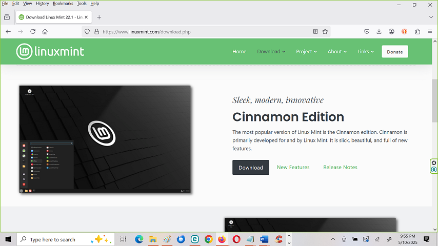 the download page for Linux Mint, Cinnamon Edition.