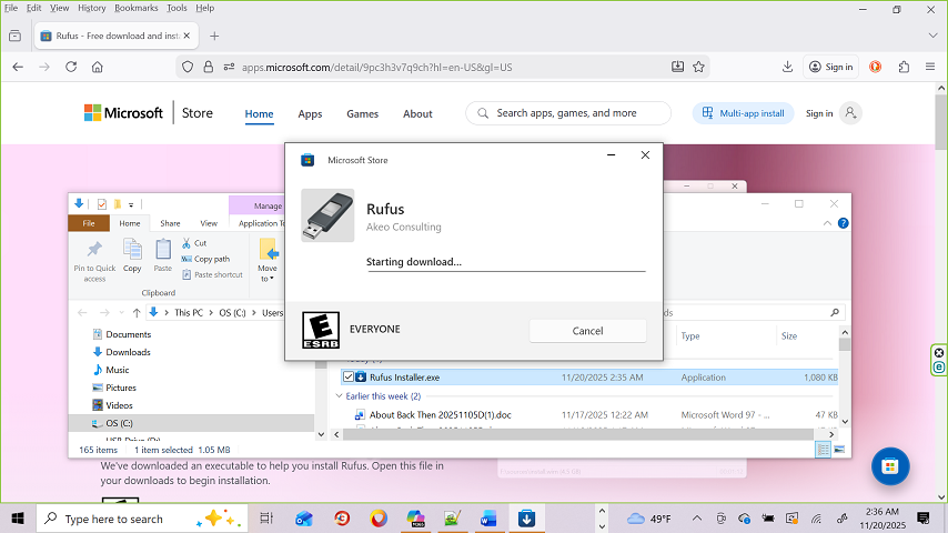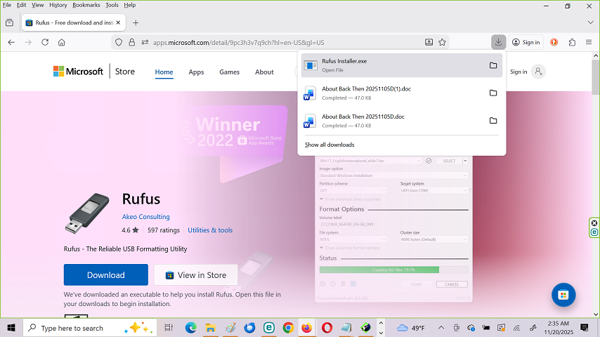 Rufus executable file appears in the Download file on